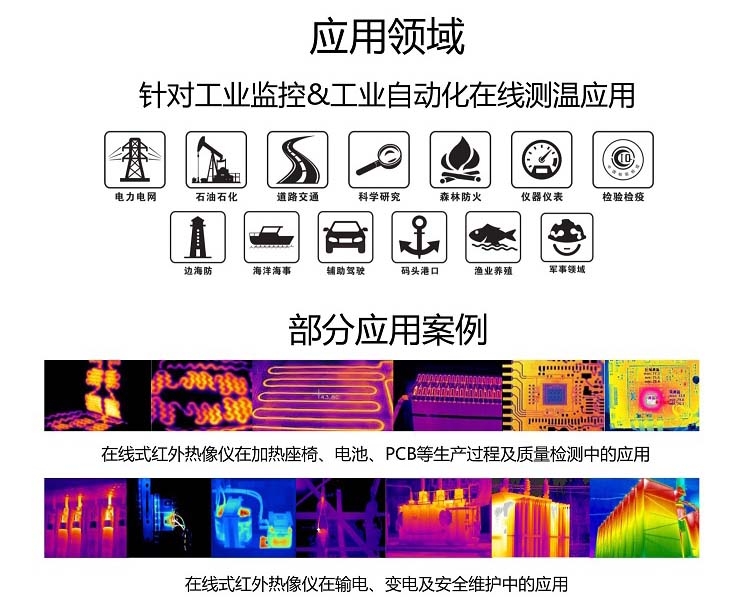 主要应用于电力电网、石油石化、轨道交通、电器电子及科学研究等民用测温领域。